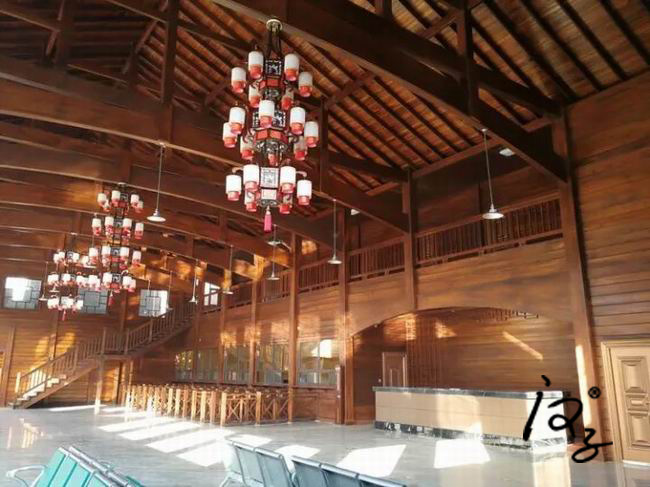 该游客中心占地面积一千余平方米,所用梁柱均为大型胶合木,全进口木材、全框架错层,胶合立柱、胶合弧形梁长度均在十余米以上。通过设计师以人为本、以自然为本的现代设计理念的融入,就更能拉近游客与建筑、自然的距离,也使实木材料的使用,更加人性化,现代化,生态化。